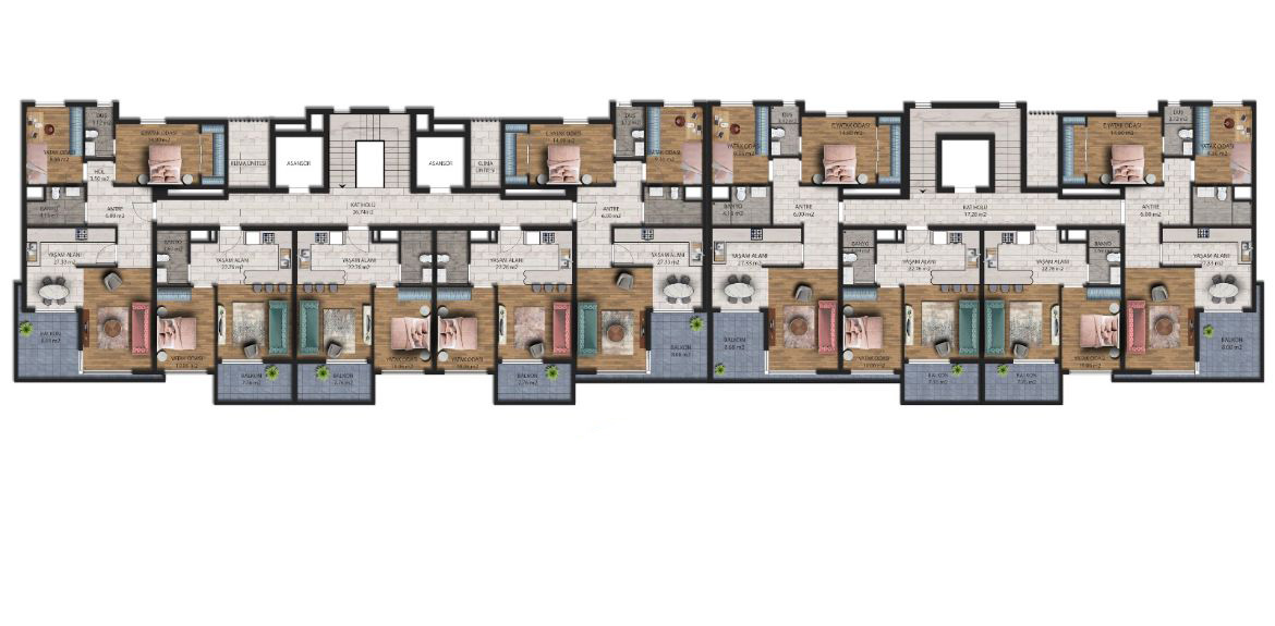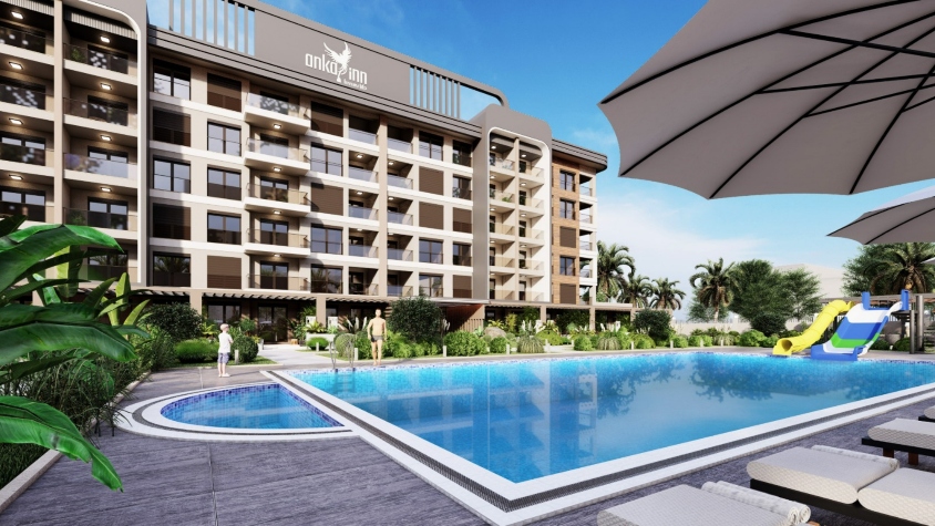 Anka Inn in the new investment area of Antalya provides several facilities, including a fitness center, swimming pool, Turkish bath, sauna, and restaurants, in addition to its spacious apartments offering luxury living. Here, you can choose and buy the best property for you, ranging from 63 m2 to 110 m2, with 1+1 ground floor, 1+1 middle floor and 2+1 middle floor apartments.
